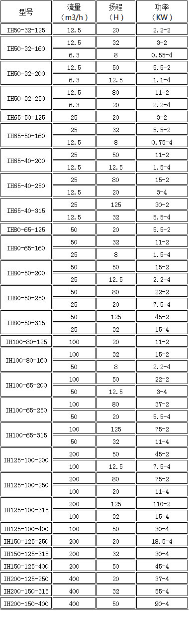 IH型化工離心泵是單級(jí)單吸(軸向吸入)懸臂式離心泵,供輸送不含固體顆粒具有腐蝕性、粘度類似水的液體。具有性能范圍廣、效率高、“三化”水平高和維修方便等特點(diǎn),其效率比F型泵平均提高5%。