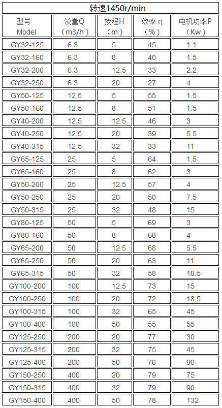 五、GY型熔鹽泵性能參數(shù)表