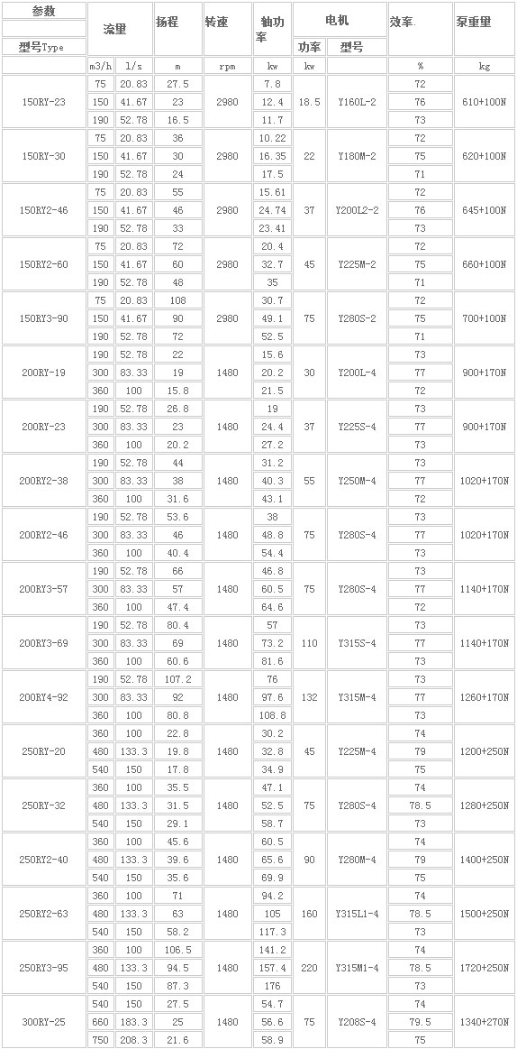 RY型熔鹽液下泵性能參數表